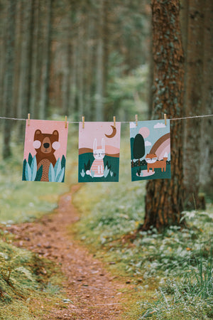 Plakātu komplekts ar 3 meža zvēriem - Lāci, Zaķi, Lapsu.